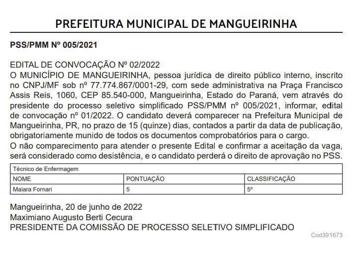 de convocação nº 01/2022. O candidato deverá comparecer na Prefeitura Municipal de