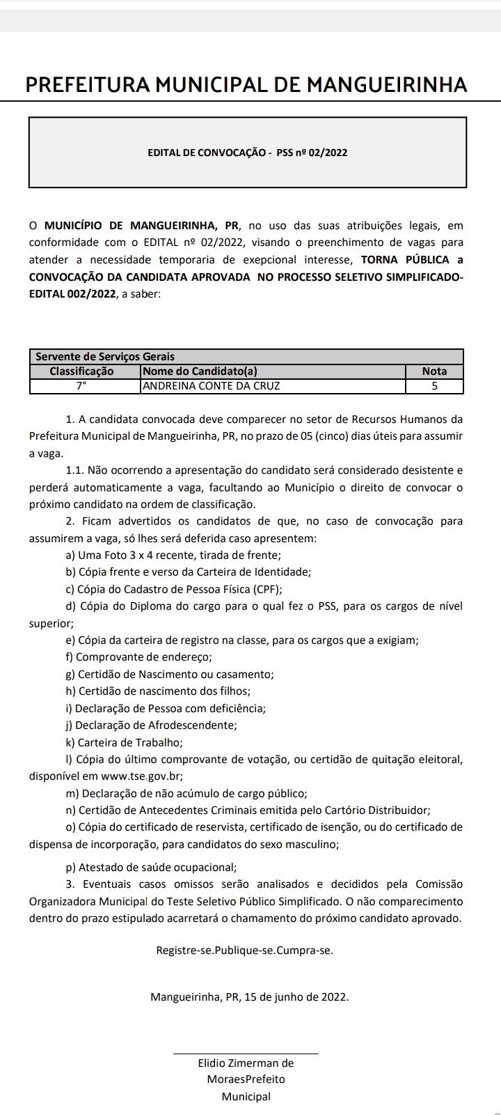 EDITAL DE CONVOCAÇÃO – PSS nº 02/2022 EM MANGUEIRINHA